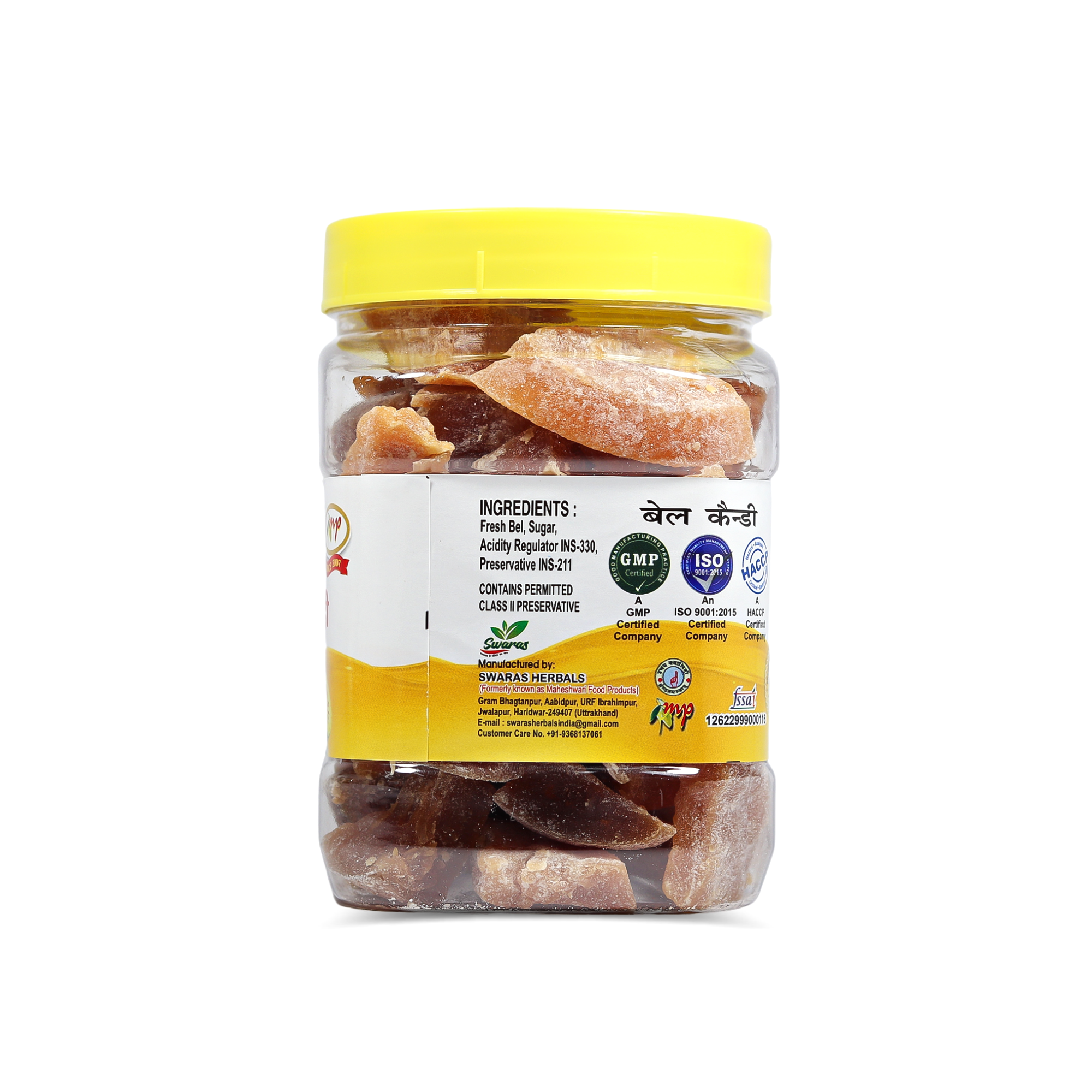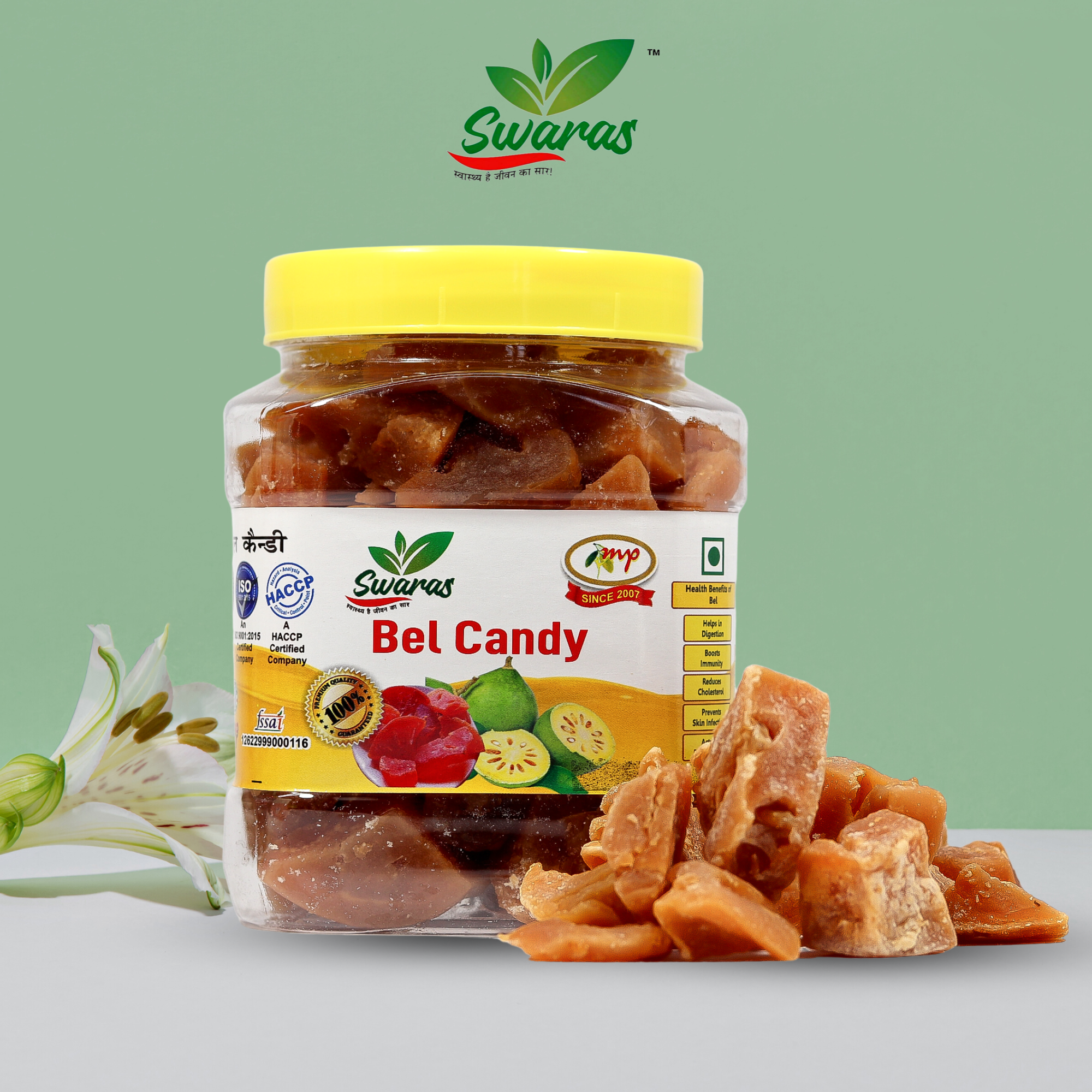 Bel Candy is a traditional Indian sweet made using the pulp of the Bael fruit (also known as wood apple or stone apple), which is known for its medicinal properties. This candy has a tangy-sweet flavor with a chewy texture, making it a delightful treat that offers both taste and health benefits.