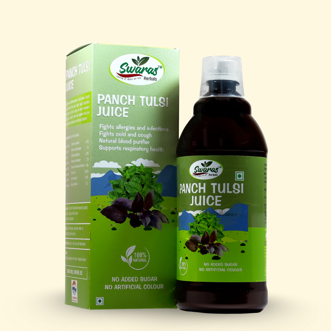 PANCH TULSI JUICE is a powerful and natural health tonic made from a blend of five varieties of tulsi (Holy Basil), known for its rich antioxidant and healing properties. This herbal juice is formulated to support immunity, respiratory health, and overall well-being. It offers a convenient way to harness the medicinal benefits of tulsi, an ancient herb revered in Ayurveda for its numerous health benefits.